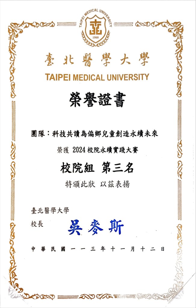 | 北醫大校院永續實踐大賽-校院組第三名 | 臺北醫學大學 | |