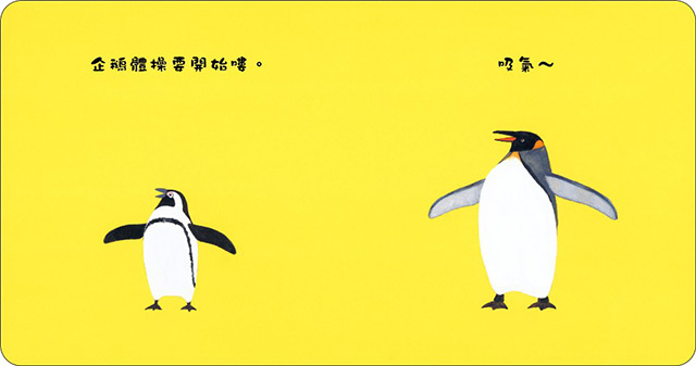 其中,《企鵝體操》更是讓我們一見鍾情的寶寶書,明亮的黃色封面上,大小企鵝專注做體操的模樣,讓人忍不住想跟著一起做運動。對2歲幼兒來說,這時期已經開始發展出較強的節奏和韻律感,喜歡做肢體的運動、跳舞或體操。《企鵝體操》書中的企鵝體操動作,都是幼兒可以跟著做的簡單律動,當他們跟著企鵝完成一樣的動作時,都能得到大大的樂趣和成就感。除了可以聽聽故事動一動,還能引導幼兒認識身體各部位和動作,可說是具有肢體律動和認知學習的雙重樂趣。