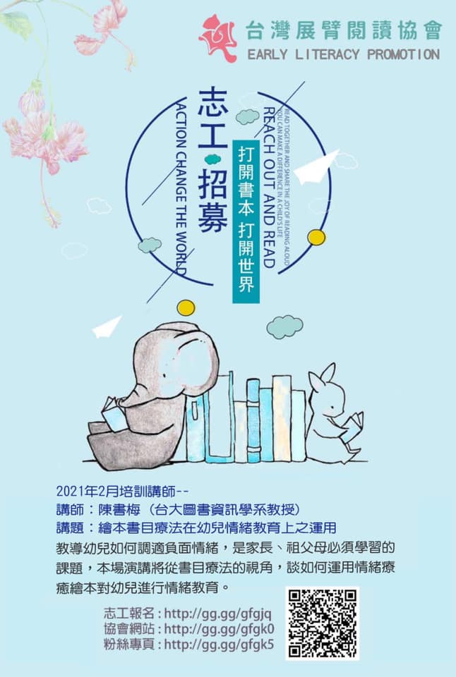 即將到來的2月的志工培訓,我們邀請到台大圖書資訊學系 #陳書梅 教授為我們解析 #書目療法 在幼兒共讀的應用,歡迎報名!