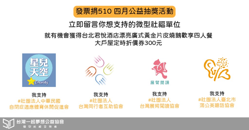 一起夢想四月份推出4家微型社福的定期定額,讓各位公益人可以每月小額穩定支持好的單位![]()