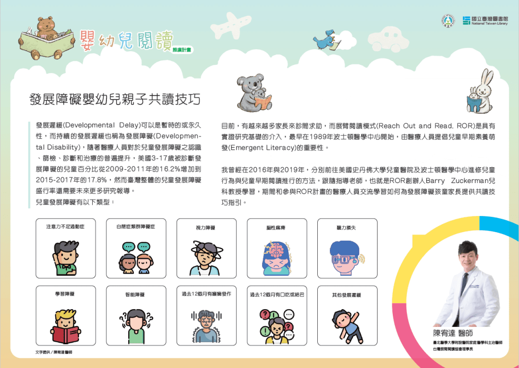 目前,有越來越多家長來診間求助,而展臂閱讀模式(Reach Out and Read, ROR)是具有實證研究基礎的介入,最早在1989年波士頓醫學中心開始,由醫療人員提倡兒童早期素養萌發(Emergent Literacy)的重要性。我曾經在2016年與2019年,分別前往美國史丹佛大學兒童醫院及波士頓醫學中心進修兒童行為與兒童早期閱讀推行的方法,跟隨指導老師,也就是ROR創辦人Barry Zuckerman兒科教授學習,期間和參與ROR計畫的醫療人員交流學習如何為發展障礙孩童家長提供共讀技巧指引。