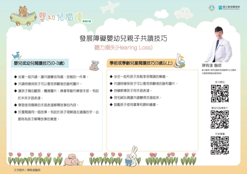 照顧者可以和醫師討論使用助聽器來幫助聽力發展,當兒童開始學習手語時,可以慢慢的將書中讀到內容及圖片讓孩子用手語來表達,並且讓孩子翻頁、觸摸圖片或練習使用手作為溝通的方式,以便為手語溝通做準備。孩子在共讀時的參與表達種況與興趣,可以做為我們選擇書籍內容等級參考。共讀有助於強化聽障兒童的口說語言技巧,讓閱讀變得有趣享受其中,是送給孩子一輩子最好的禮物。