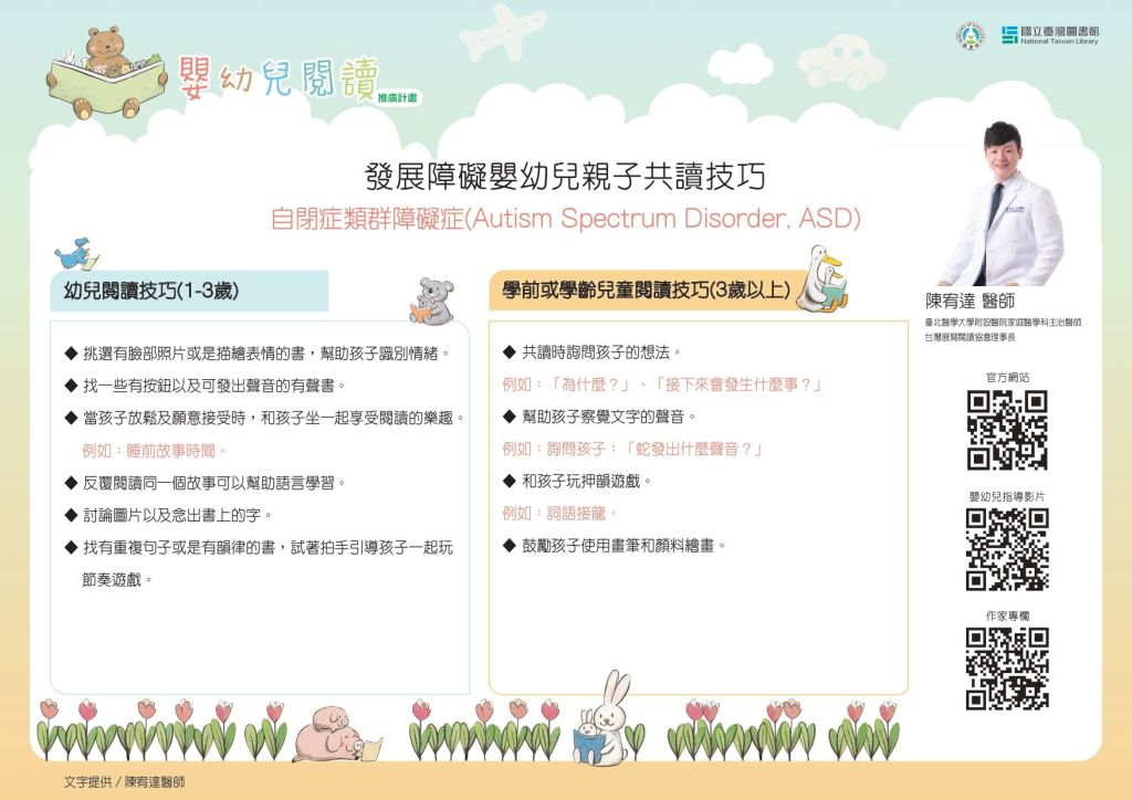 親子共讀時,ASD的孩子可能很難做到與照顧者有眼神接觸、專心看著書上的圖畫、理解故事的字、說出書裡東西的名字。同時,合併語言發展遲緩也很常見,這時候共讀的親子活動特別重要!雖然ASD的孩子可能只能和你坐一下下,但他們喜歡大人的陪伴,一起分享好玩、有趣的東西。當專注力變得更長、可以坐得更久的時候,他們可以和照顧者一起指圖片、覆述文字或句子、用肢體語言溝通,或是用其他方式讓照顧者知道他們正要分享一件有意義的事。如果孩子喜歡日常規律的活動,可以嘗試和他共讀他最喜歡的書籍,來幫助孩子從某項活動轉移到另一項活動,舉例來說從家裡移動到學校,或者是從遊戲到睡覺。與治療師和老師討論學習閱讀如何幫助孩子更能了解書本上的文字、社交技巧、新活動以及在不同活動間轉換的能力。