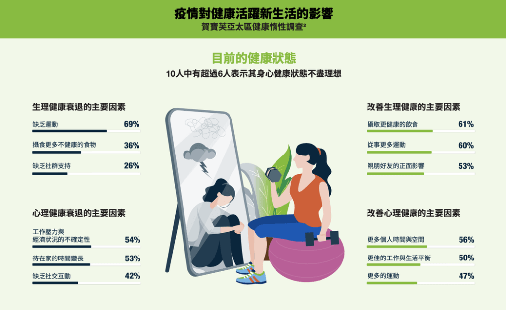 近期發布的美商賀寶芙2022年關鍵營養報告中顯示,新冠肺炎爆發以來,超過60%國人對自己的身心健康狀況感到擔憂,在警覺身心狀態不理想的民眾中,6成認為原因為缺乏運動、並有4成認為可能與飲食攝取不均衡有關。對此,陳宥達醫師表示:「對民眾而言,改變生活習慣的起步很難,『漸進』改變是最重要的,並藉此達成提升保護力、增加基礎代謝、遠離疾病的目的。」。