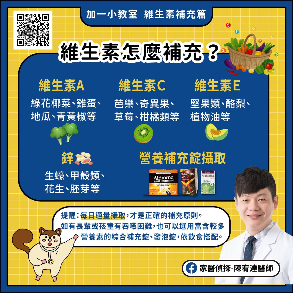 除了維生素C外,也需補充其它如維生素A、D、E和鋅等關鍵營養素。陳宥達表示,雖無直接研究指出鋅可預防或治療新冠肺炎,缺乏鋅可能導致免疫力降低,增加感染風險;且鋅補充劑或含片也常用於治療感冒或呼吸系統疾病,研究發現,兒童上呼吸道感染時,補充足量鋅可縮短病程、減少病毒數。