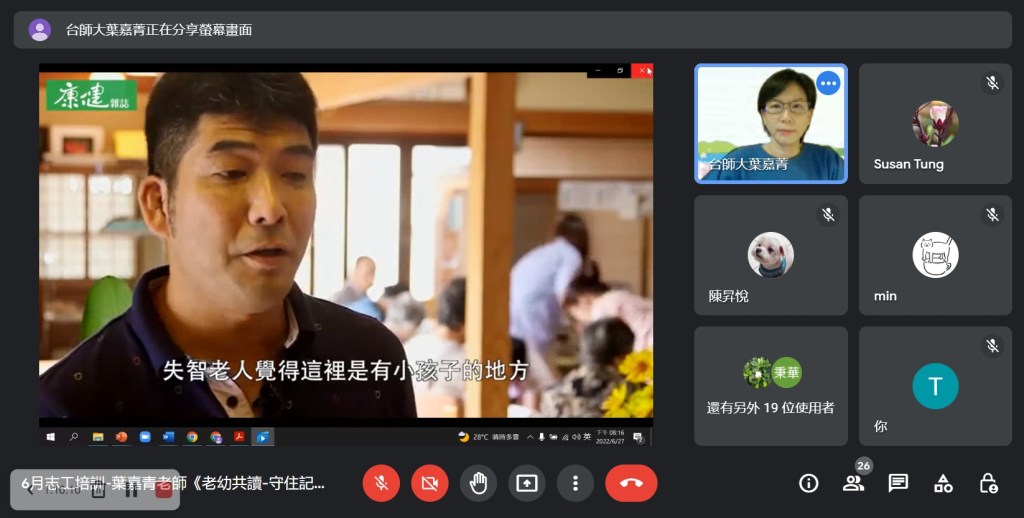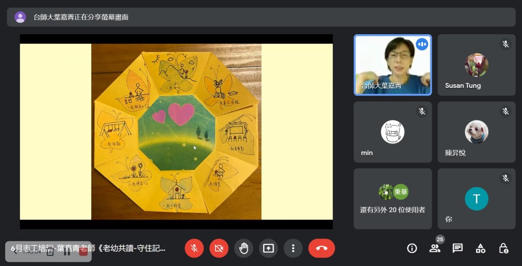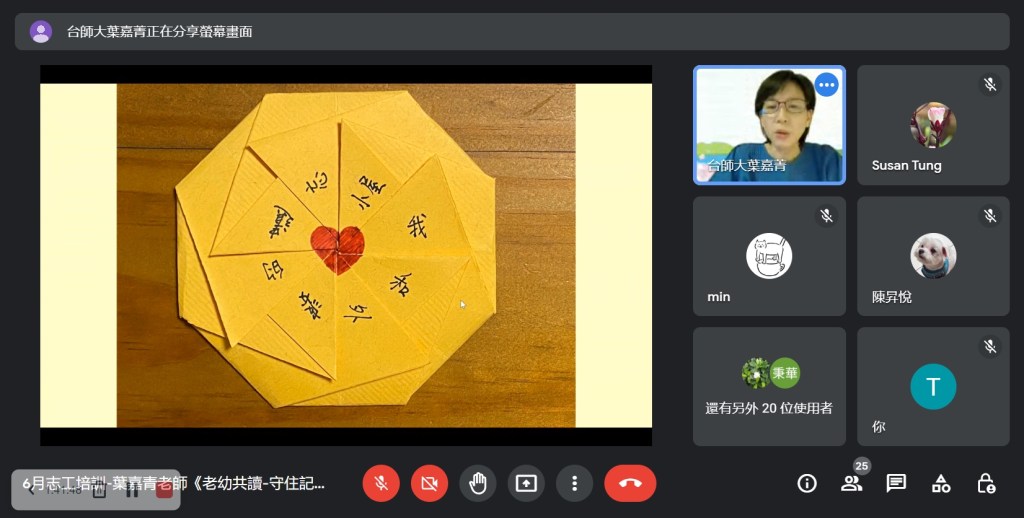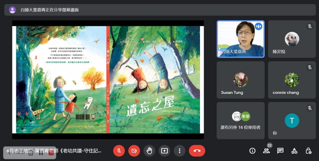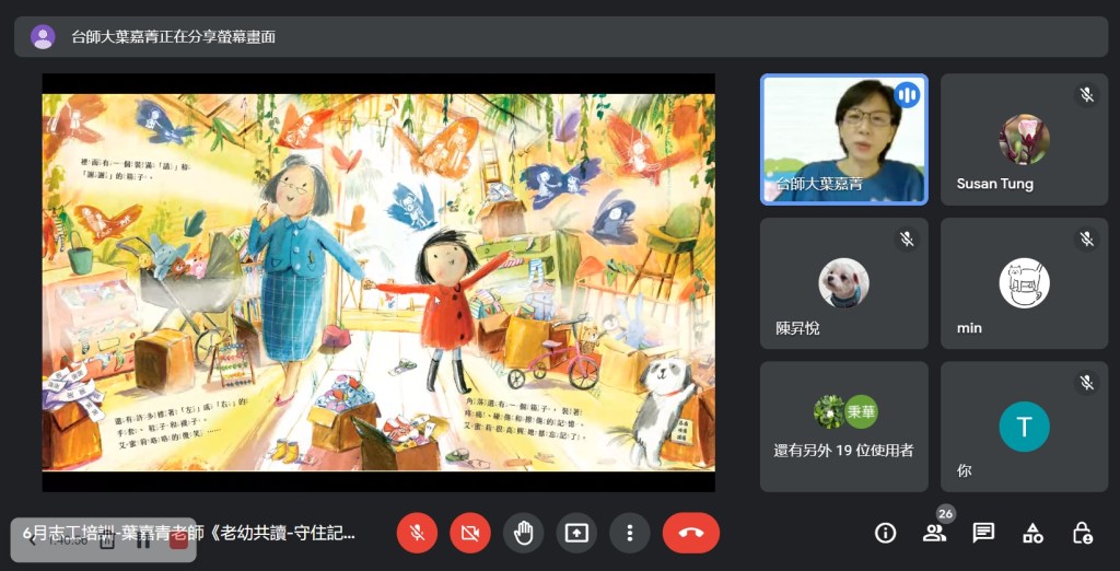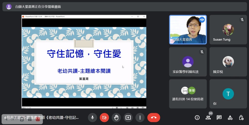 Covid-19疫情持續,展臂閱讀志工培訓仍維持線上辦理,本月非常榮幸能邀請臺灣閱讀協會常務理事葉嘉青老師分享『老幼共讀-守住記憶,守住愛』,如何用繪本閱讀提供老幼愉快的共讀經驗,增進彼此的感情與身心健康。