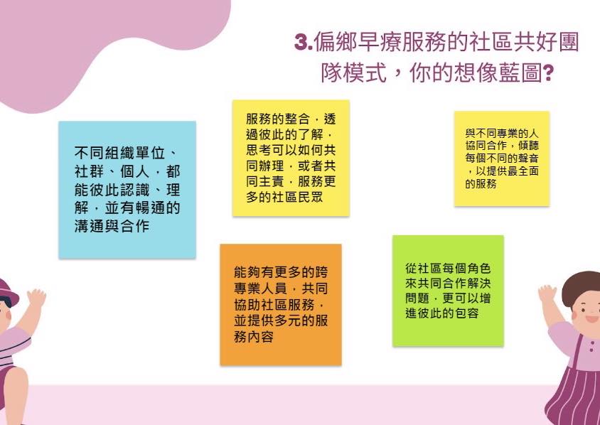 遊戲化工作坊:下半場進入角色扮演,進入社區劇情。有位單親阿公帶著語言有點緩的5歲孫女開始…由於里長認為孩子的學習不能拖,通報相關單位展開了偏鄉早療家庭服務。