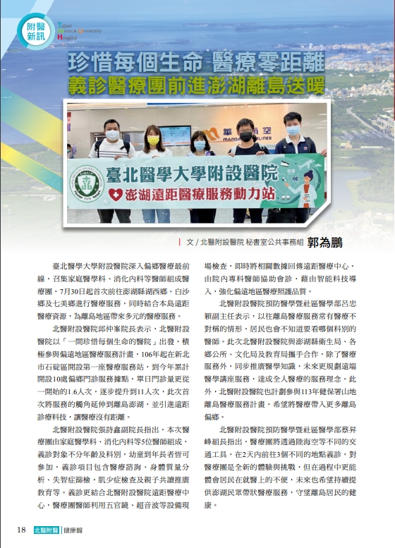 臺北醫學大學附設醫院深入偏鄉醫療最前線,召集家庭醫學科、消化內科等醫師組成醫療團,7月30日起首次前往澎湖縣湖西鄉、白沙鄉及七美鄉進行醫療服務,同時結合本島遠距醫療資源,為離島地區帶來多元的醫療服務。