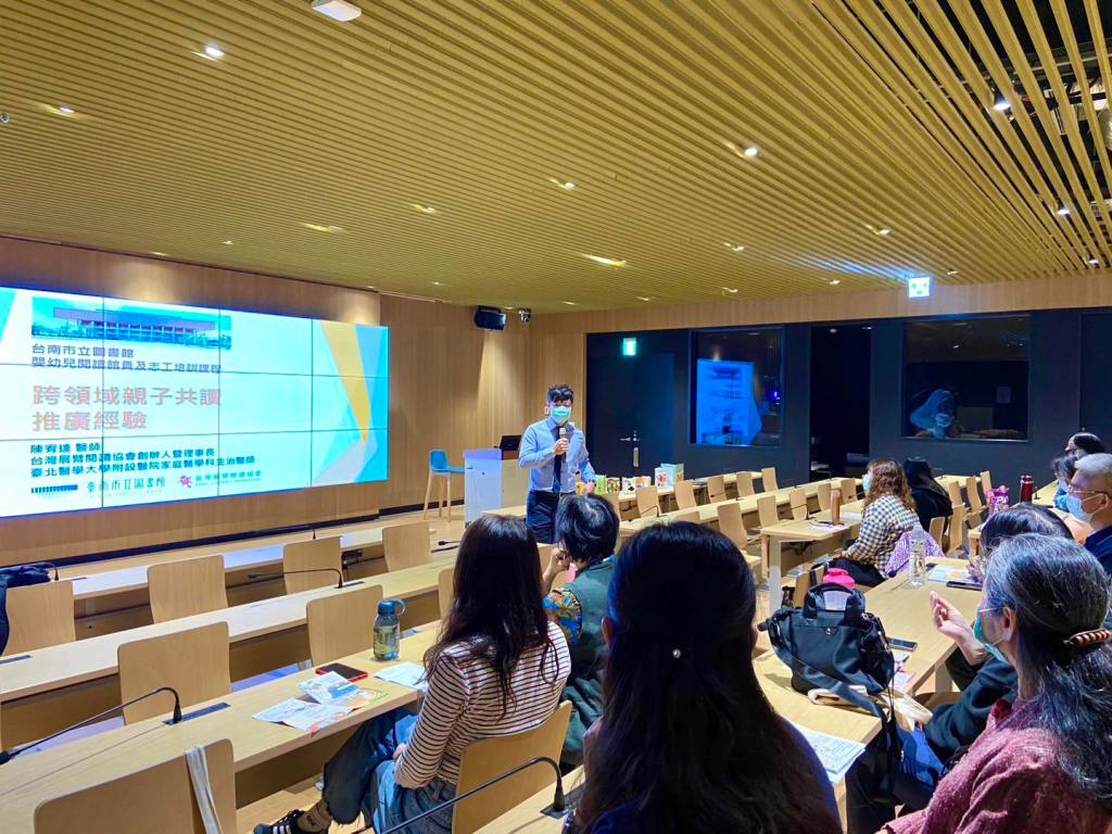 陳宥達醫師以「親子共讀的跨域合作」為題,讓參與課堂的學員分組討論,如何把資源觸及到弱勢族群,從設定目標、設計服務、成果收集以及克服障礙。