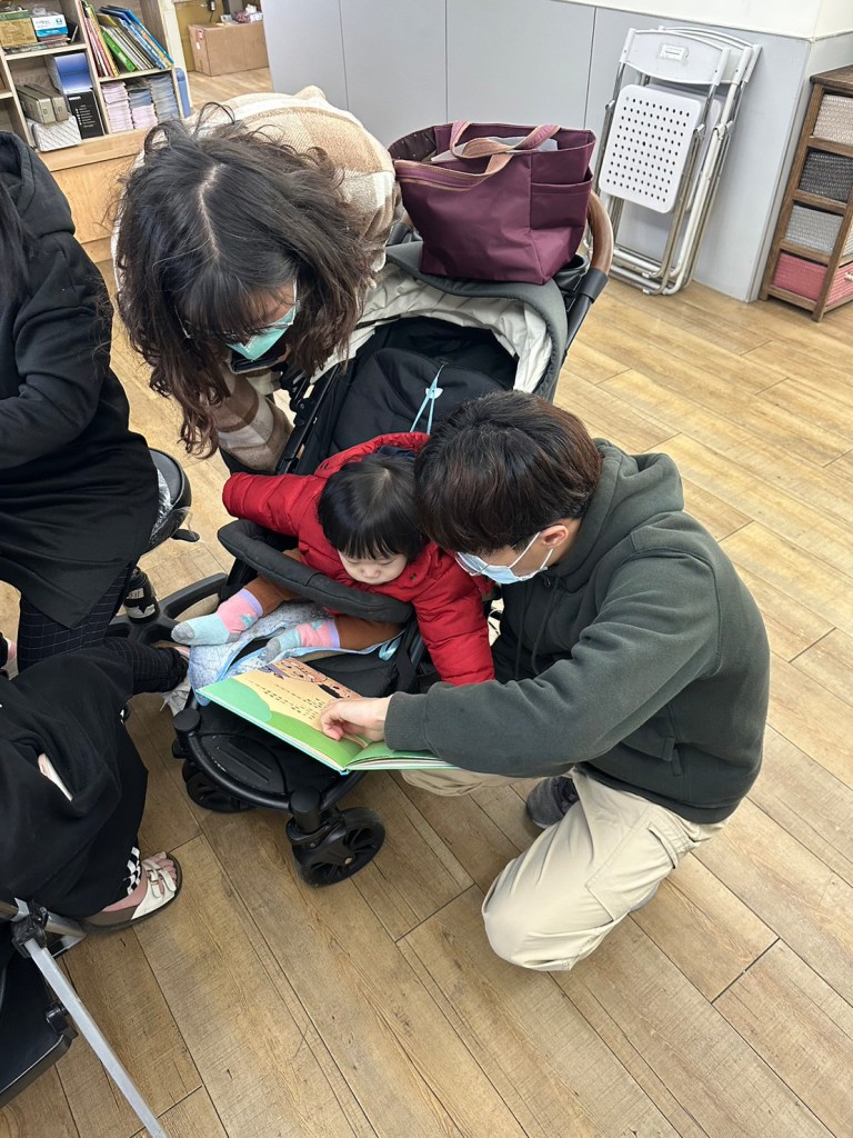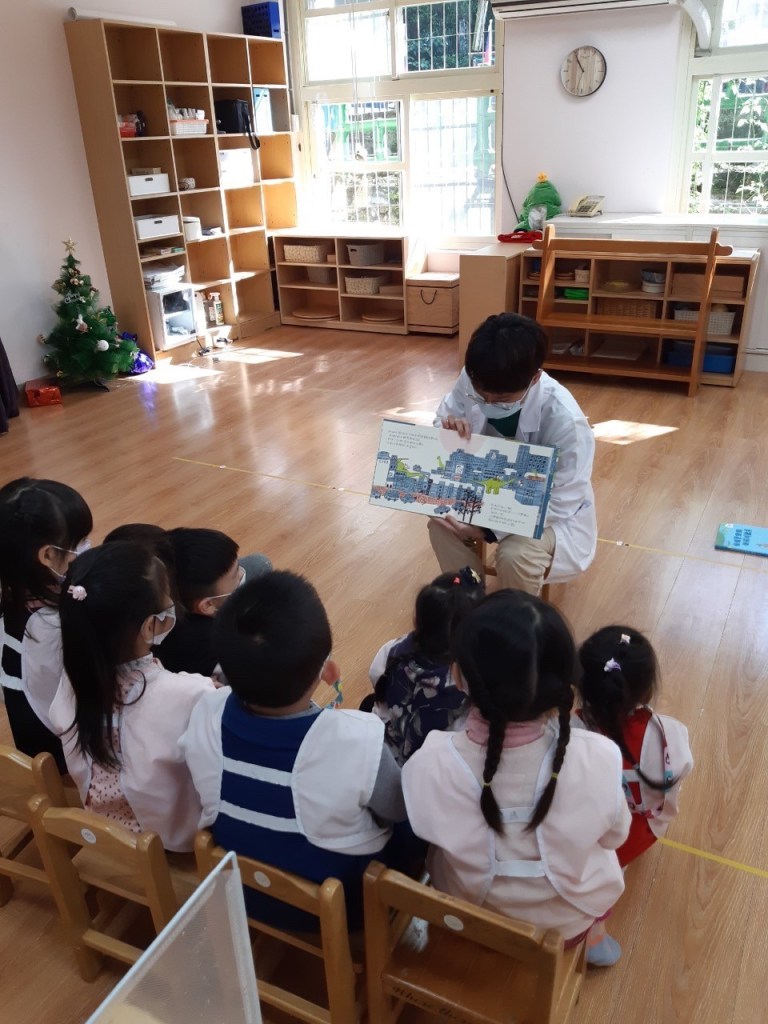 另一位何醫師心得的回饋分享,我發現小小孩跟大小孩的共讀方式真的蠻不一樣的,在衛生所的時候有一位一歲小女孩其實不會和我們有太多互動,發出一些聲音跟一直想要碰書指圖片而已,在幼兒園的時候,小朋友都非常活潑,每個人對圖片都有不同的想法還會討論故事主角的行為動機,常常會直接偏離故事主軸還需要老師來維持秩序,很失控但也蠻有趣的。