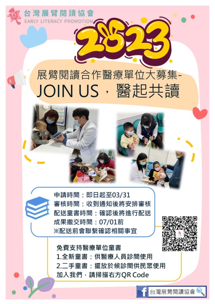 感謝各單位的支持以及認同親子共讀促進兒童發展的理念,2023年我們持續以行動支持醫療院所,將免費提供上千本適齡童書📔📒📗。