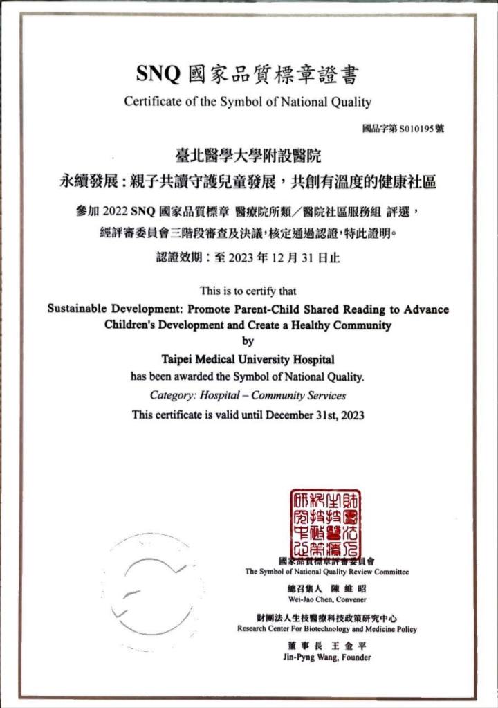 恭喜展臂閱讀創辦人陳宥達醫師與臺北醫學大學附設醫院團隊榮獲第25屆SNQ認證! 永續發展:親子共讀守護兒童發展,共創有溫度的健康社區🏆️ 用SDGs永續的精神實踐醫療與教育平等,以創新的照護模式,將親子共讀推廣,邁出醫院步入社區,幫助偏遠及弱勢家庭。❤️ 感謝過去一路支持我們的各位粉絲、朋友、民間團體與企業,一起參與共同擴大社會影響力,在少子化高齡化的社會危機下,每個孩子的發展都至關重要。 我們相信藉由具有實證的ROR模式所播下的種子,已經持續萌芽!🌱 分享此文: 分享到 X(在新視窗中開啟) X 分享到 Facebook(在新視窗中開啟) Facebook 喜歡 正在載入... 相關 發表者:社團法人台灣展臂閱讀協會 檢視 社團法人台灣展臂閱讀協會 的所有文章