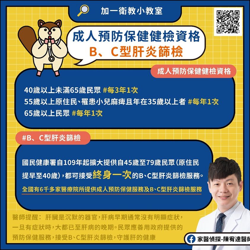 國民健康署自109年起擴大提供自45歲至79歲民眾(原住民提早至40歲),都可接受終身一次的B、C型肝炎篩檢服務,目前全國有6千多家醫療院所提供成人預防保健服務及B、C型肝炎篩檢服務。
