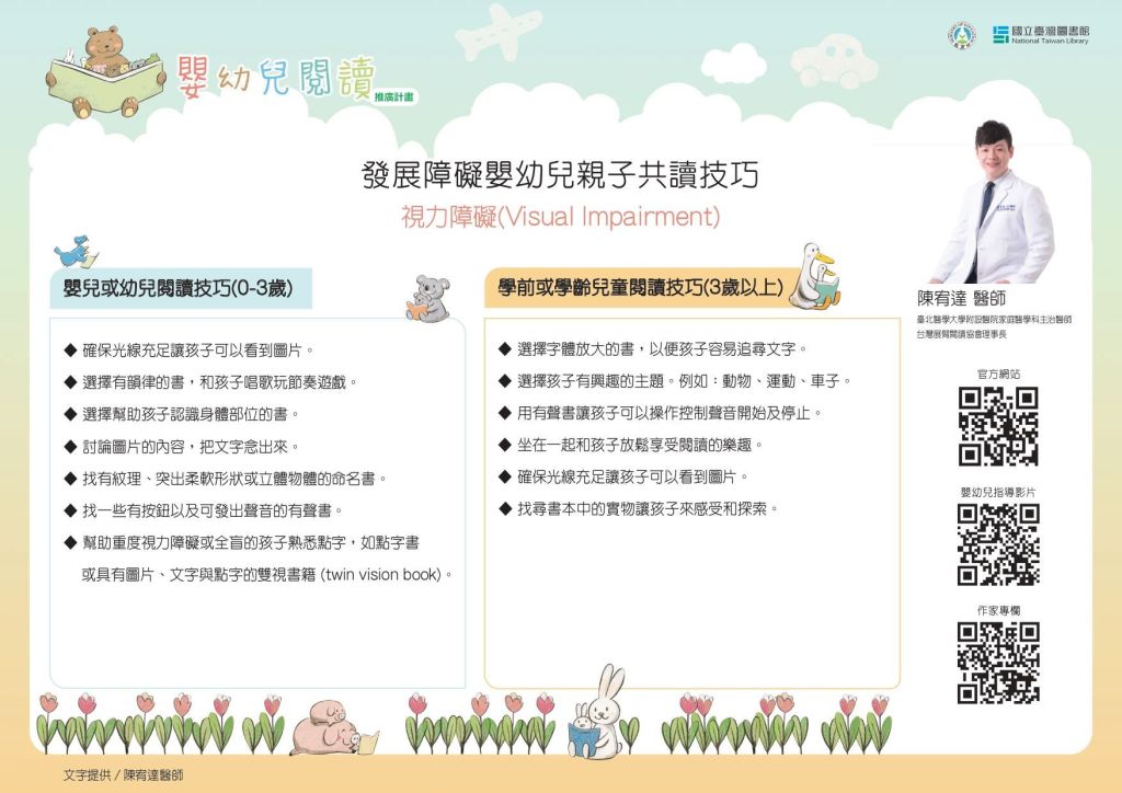 運用充滿感官刺激設計的書籍,例如觸感書、有聲書、翻翻書等,可以幫助中度以上視障孩童,學習善用手指獲得更多環境訊息,來增進知識與經驗。照顧者可以藉由引導視障孩子觸碰來感受書面上的紋路,同時搭配指物命名(指著圖片說出圖片名稱)等方式,讓孩子知道家長分享一件有意義的事。孩子喜歡讓照顧者抱著,或一起在沙發上或地板上坐著,我們可以選擇光線充足的地方和孩子共讀討論故事和圖片內容,幫助孩子來聆聽學習文字。此外,建議照護者可以和老師或諮商師學習如何運用共讀幫助孩子的運動及語言發展,以及學習使用符號系統(如點字系統)。