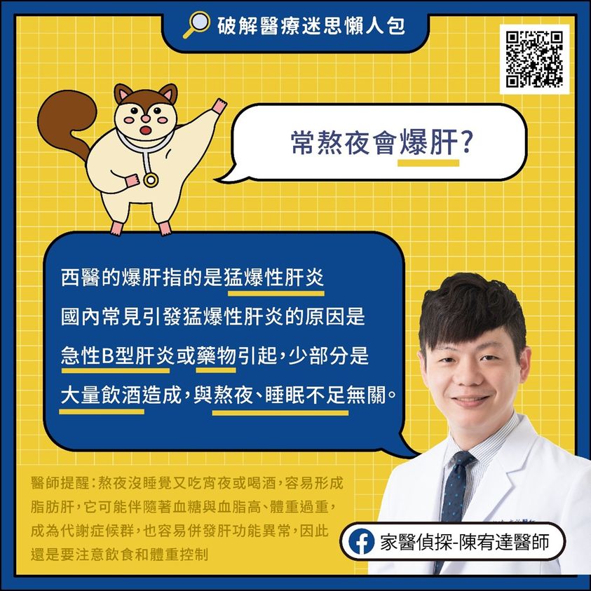 醫師提醒:熬夜沒睡覺又吃宵夜或喝酒,容易形成脂肪肝,它可能伴隨著血糖與血脂高、體重過重,成為代謝症候群,也容易併發肝功能異常,因此還是要注意飲食和體重控制!