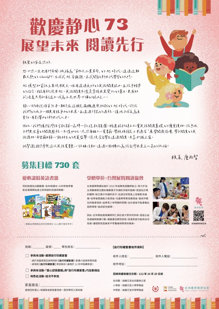 感謝這份共鳴,我們即將在今年底明年初與靜心中小學攜手合作!我們將透過募集優質童書,支持展臂閱讀在更多偏鄉地區推廣親子共讀。這不僅是一個活動,更是一份對台灣未來深深的承諾,希望用愛心書籍,為每個孩子打開知識的大門,創造更永續、共融的社會!