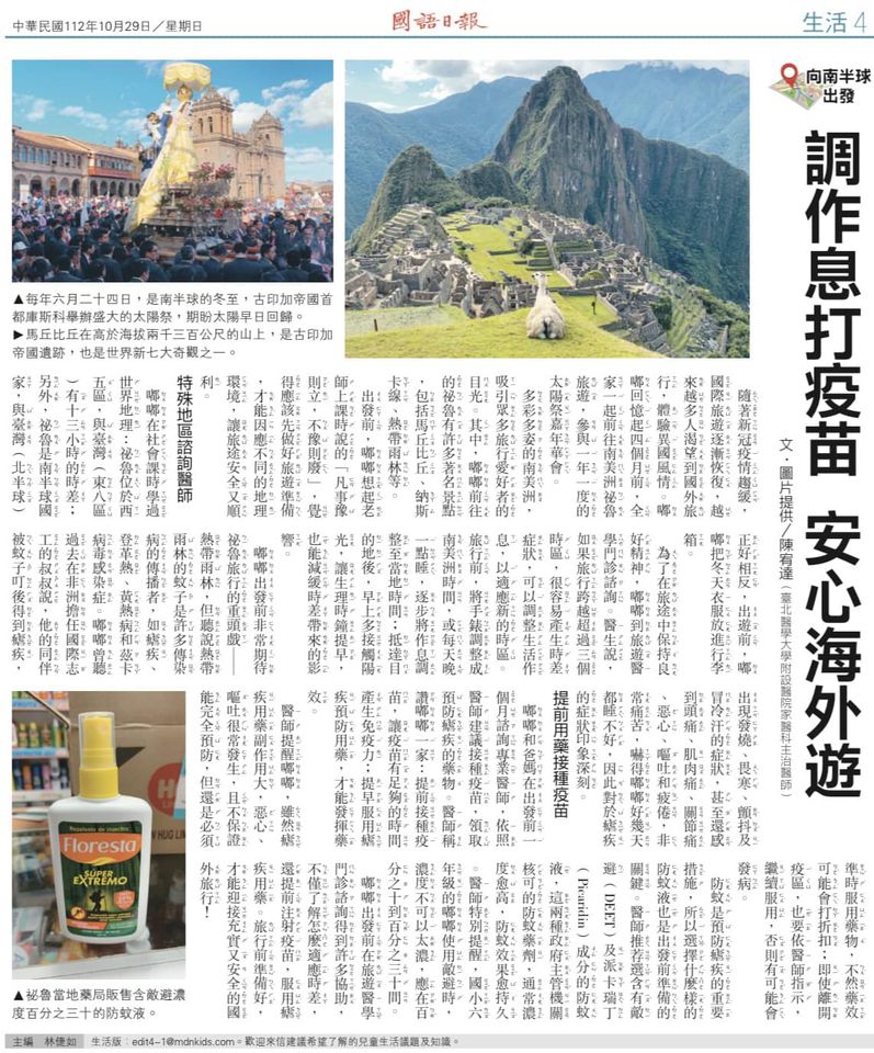 之前邀稿的旅遊醫學文章終於刊於國語日報生活版10/29。宥達醫師喜歡旅遊,在上次前往南美洲秘魯當志工過程中,分享當地有趣見聞及旅遊醫學知識!