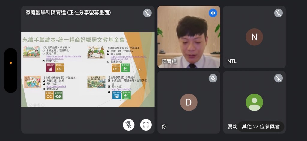 此外,課程中還介紹了「永續手掌繪本」,如《唉呀!我忘記了》這本手掌繪本,由統一超商好鄰居文教基金會提供。這本書的素材和創意讓我們學習如何友善對待年長者,並將這種關懷融入日常生活。