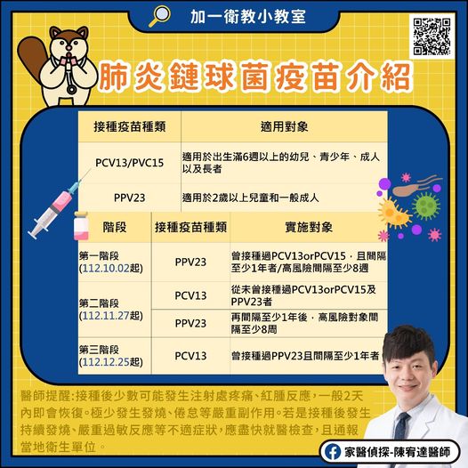 • 第一階段(112.10.02起):曾接種過PCV13orPCV15,且間隔至少1年者/高風險間隔至少8週,可公費接種1劑PPV23