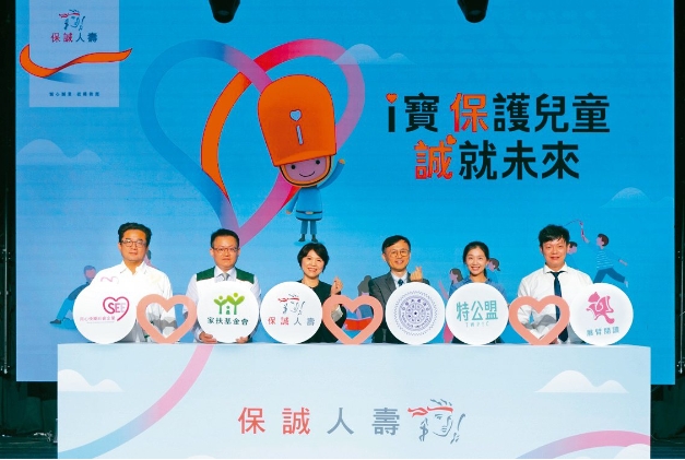用心快樂社企執行長趙士懿(左起)、家扶基金會執行長周大堯、保誠人壽總經理王慰慈、清華大學教授曾文志、特公盟理事長張雅琳、台灣展臂閱讀協會理事長陳宥達,共同攜手倡議兒童保護。吳榮邦/攝影