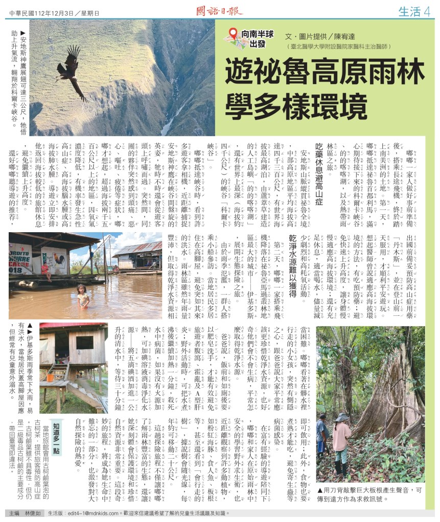 宥達醫師的門診同時是 CDC 認證的旅遊醫學合約門診,出國前若有健康疑慮,歡迎來諮詢。前往秘魯旅遊建議接種黃熱病疫苗、了解瘧疾防範措施,並準備高山症用藥。提前做好功課,享受精彩秘魯之旅!
