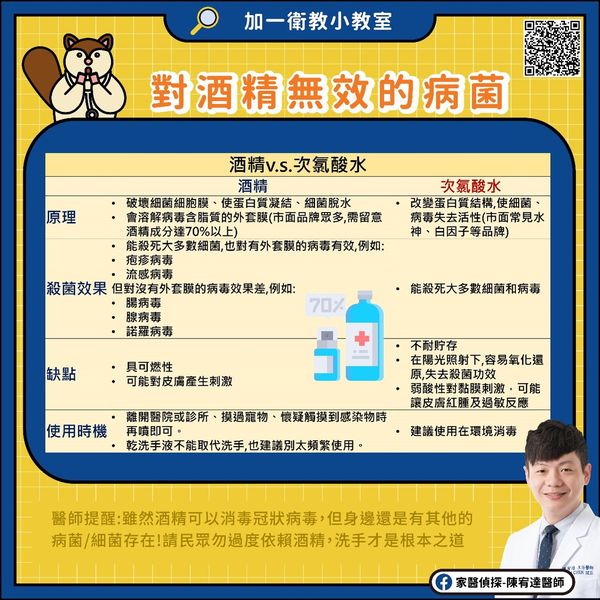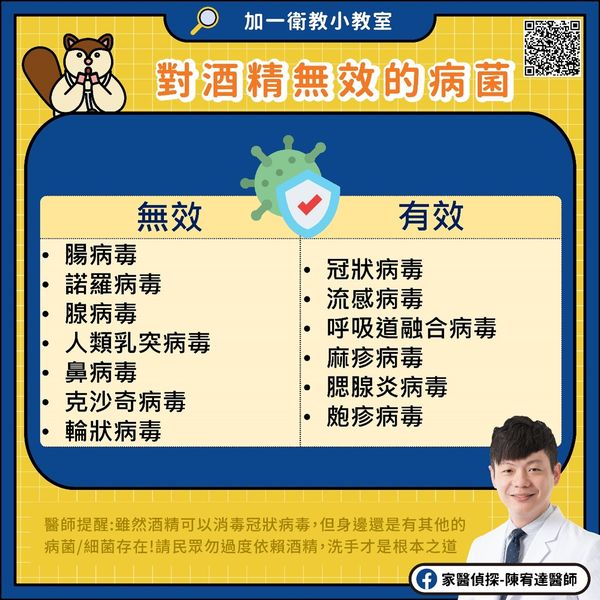 醫師提醒:雖然酒精可以消毒冠狀病毒,但身邊還是有其他的病菌/細菌存在!請民眾勿過度依賴酒精,洗手才是根本之道