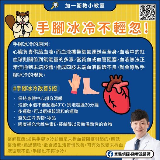 醫師提醒:如果手腳冰冷診斷是末梢血管阻塞引起的,應就醫治療,透過藥物、飲食或生活習慣改善,可有效改變末梢血液循環不良,手腳也不再冰冷。