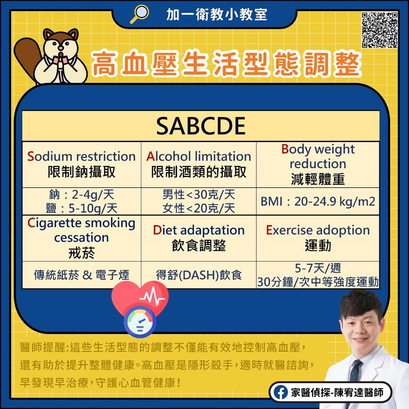 此外,對於日常血壓控制、降低風險,除了吃藥控制外,配合生活型態調整也是重要的一環!今天宥達醫師要帶大家一起來看看高血壓SABCDE六大原則來調整生活型態