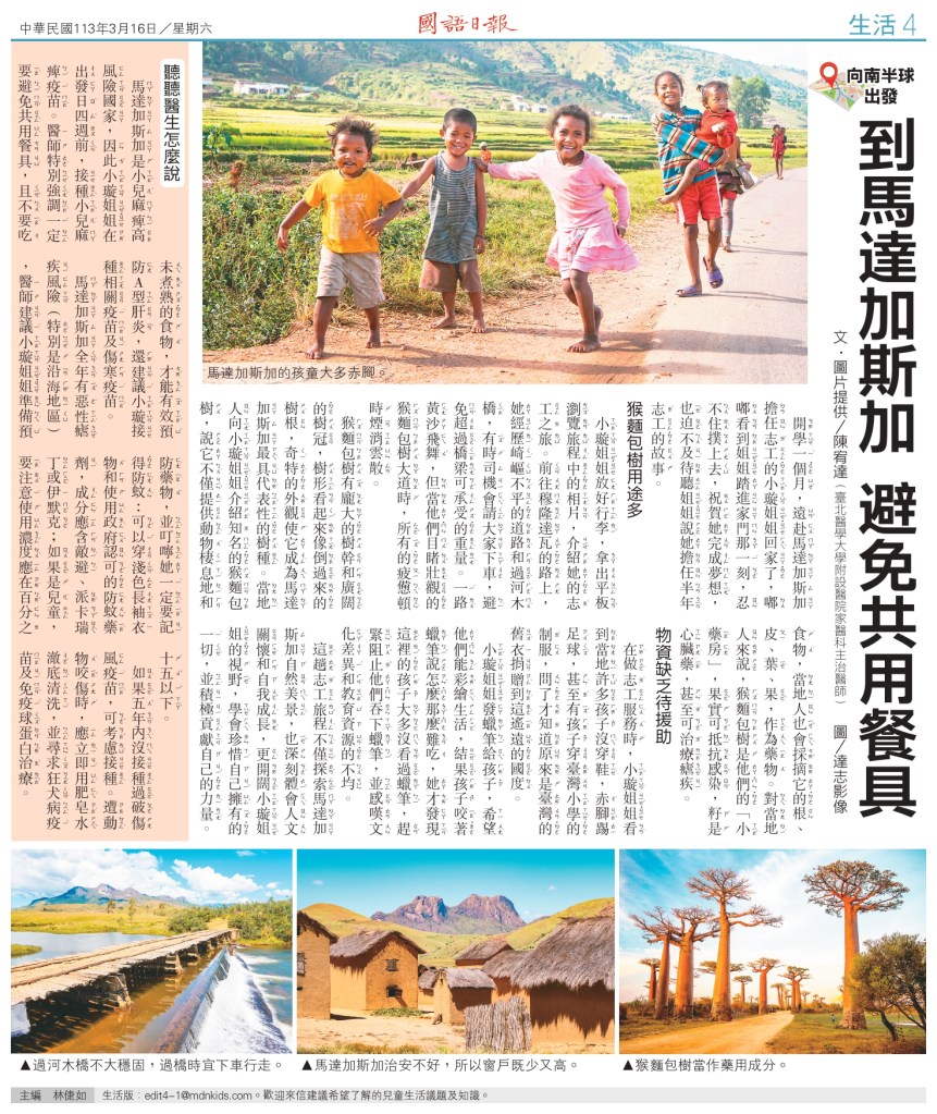 宥達醫師曾經在2011年跟路竹會醫療團到馬達加斯加義診,當然大家提到馬達加斯加時,一定會想到猴麵包樹、變色龍、馬達加斯加卡通裡的狐猴… 這篇要跟大家分享與台灣相近,位於大陸旁的海島馬達加斯加,有哪些奇特的旅遊景點,以及需要注意的旅遊醫學知識。