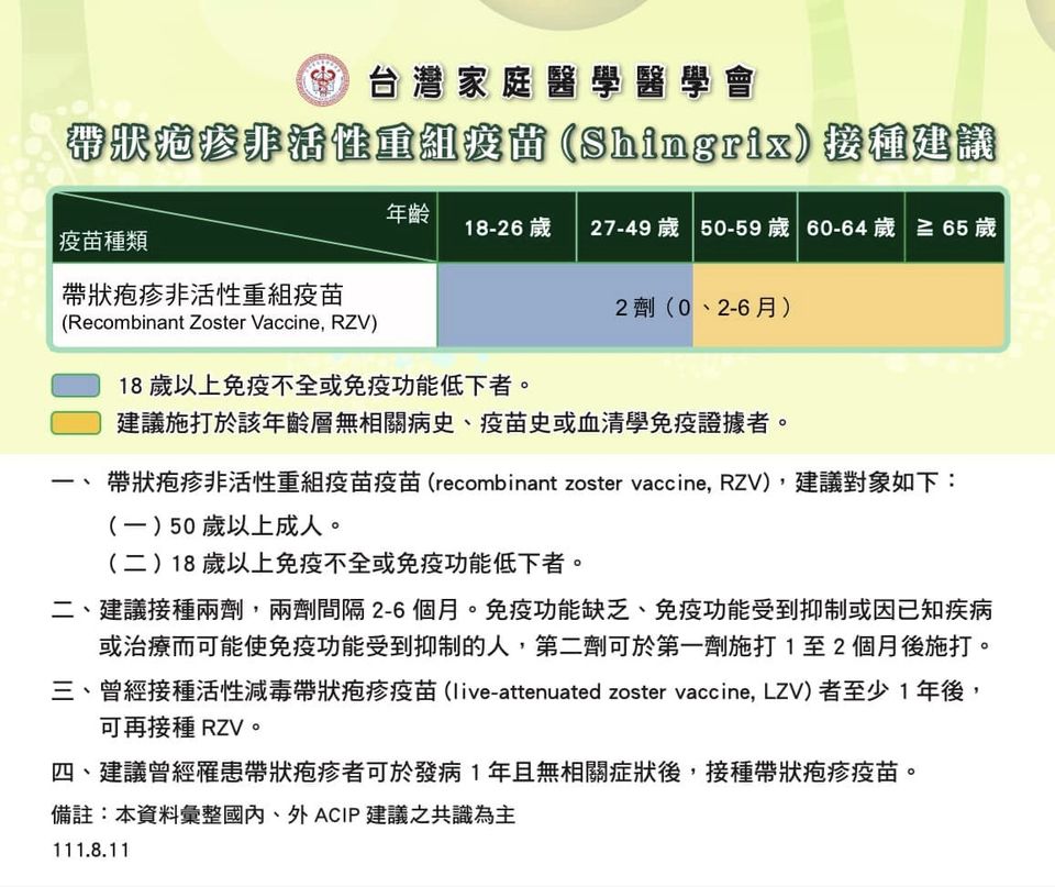 附上家庭醫學會針對帶狀皰疹疫苗的建議,提供供大家參考!