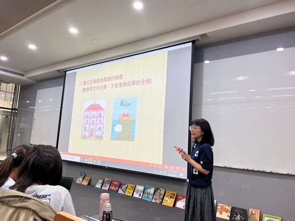 陳宥達醫師將展臂閱讀模式分享給學弟妹,包括親子共讀對健康的影響、如何運用兒童繪本評估兒童發展、各年齡兒童閱讀行為、適齡繪本設計等內容。