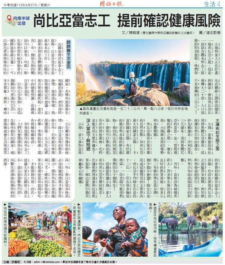 尚比亞(Republic of Zambia)擁有台灣二十倍大的土地,卻只有台灣三分之二的人口。最著名的莫西奧圖尼亞大瀑布與尼加拉瀑布、伊瓜蘇瀑布並列世界三大瀑布,還有卡富埃國家野生公園,這裡是大象