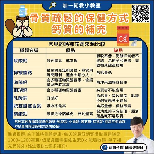醫師提醒:為了維持骨骼健康,每天的最低鈣質攝取量建議是1000–1200毫克,但是身體需要維生素D才能吸收鈣,除了補充鈣質外,維生素D也需多補充