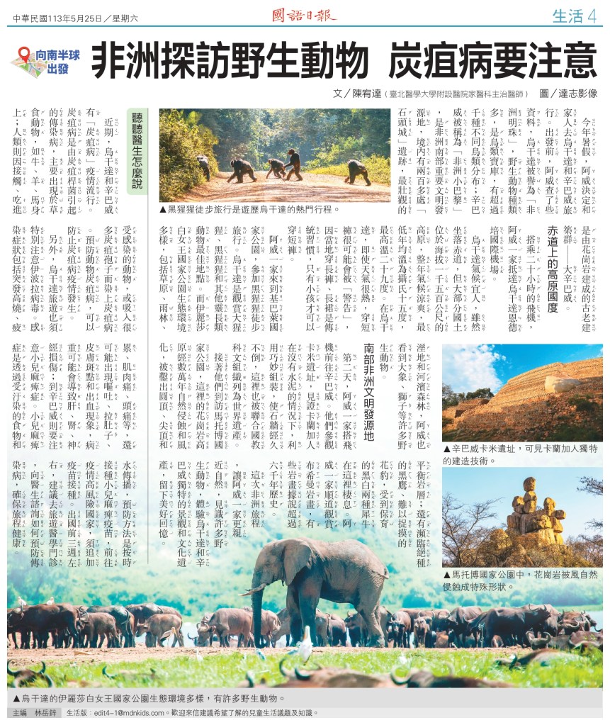 在旅遊醫學方面,當地目前有「炭疽病」和「猴痘(M痘)」疫情,旅客需特別注意。