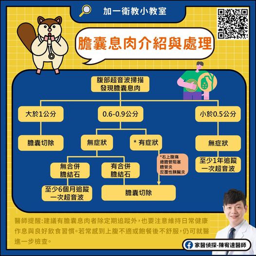 醫師提醒:建議有膽囊息肉者除定期追蹤外,也要注意維持日常健康作息與良好飲食習慣。若常感到上腹不適或飽餐後不舒服,仍可就醫進一步檢查。