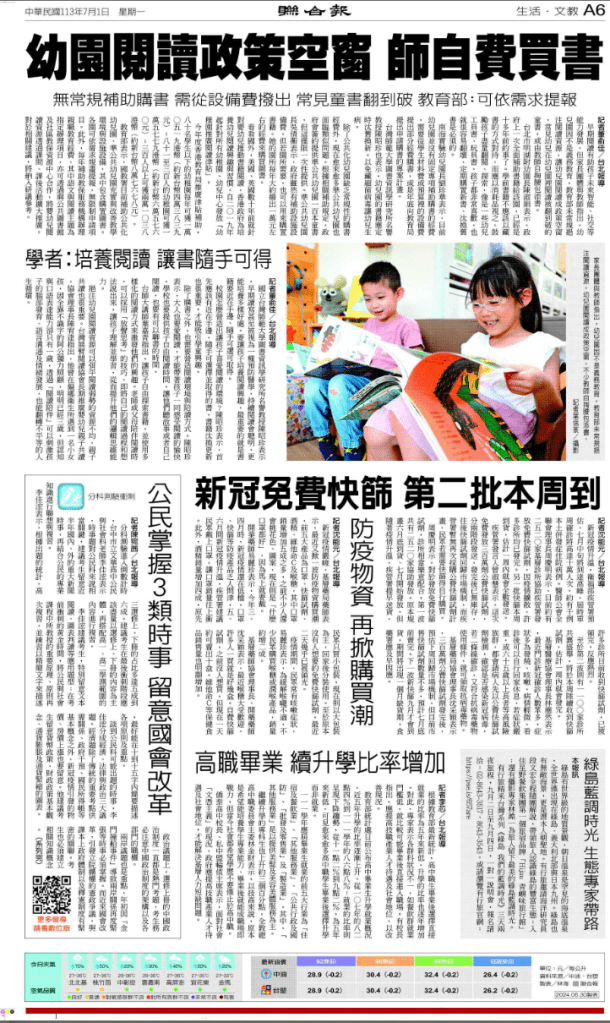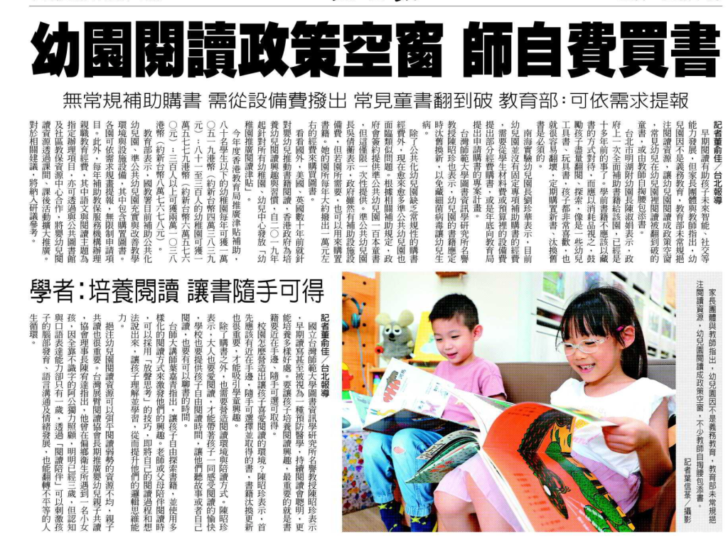 教育部表示,國教署補助公共化幼兒園、準公共幼兒園充實與改善教學環境與設施設備,其中包含購置圖書。各園可依需求規畫提報,無限制申請項目。此外,國教署每年補助教保服務機構辦理親職教育經費,其中語文與閱讀主題為指定辦理項目,亦可透過與公共圖書館及社區教保資源中心合作,將嬰幼兒閱讀資源透過課間、課後活動擴大推廣。