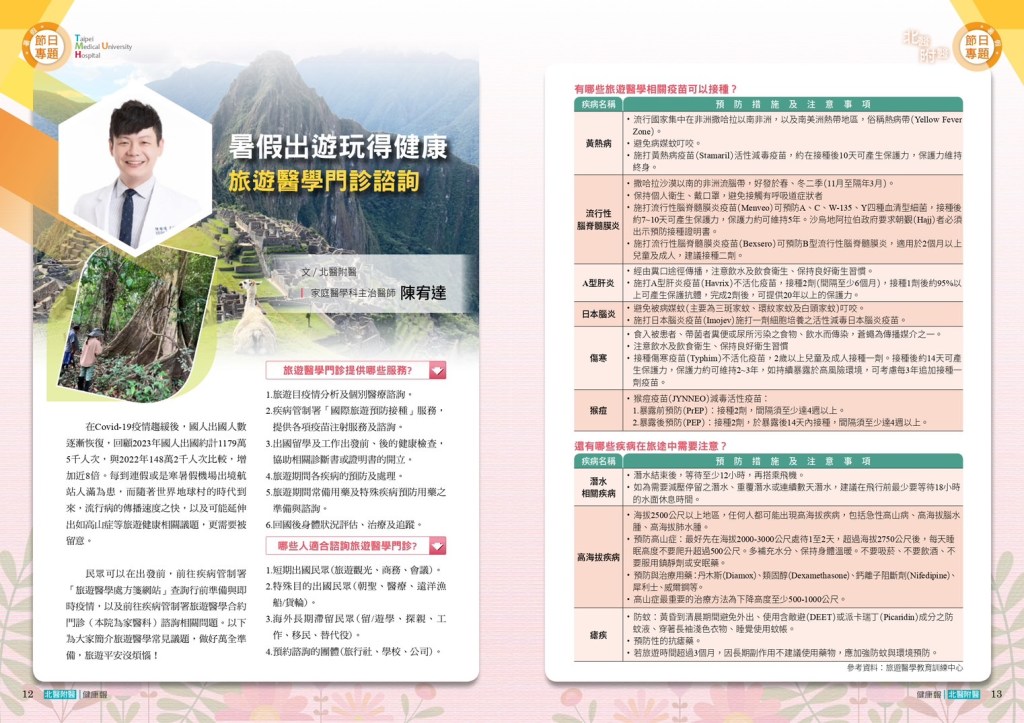 目前民眾可以在出發前,前往疾病管制署「旅遊醫學處方箋網站」查詢行前準備與即時疫情,以及前往疾病管制署旅遊醫學合約門診(本院為家醫科)諮詢相關問題。以下為大家簡介旅遊醫學常見議題,做好萬全準備,旅遊平安沒煩惱!