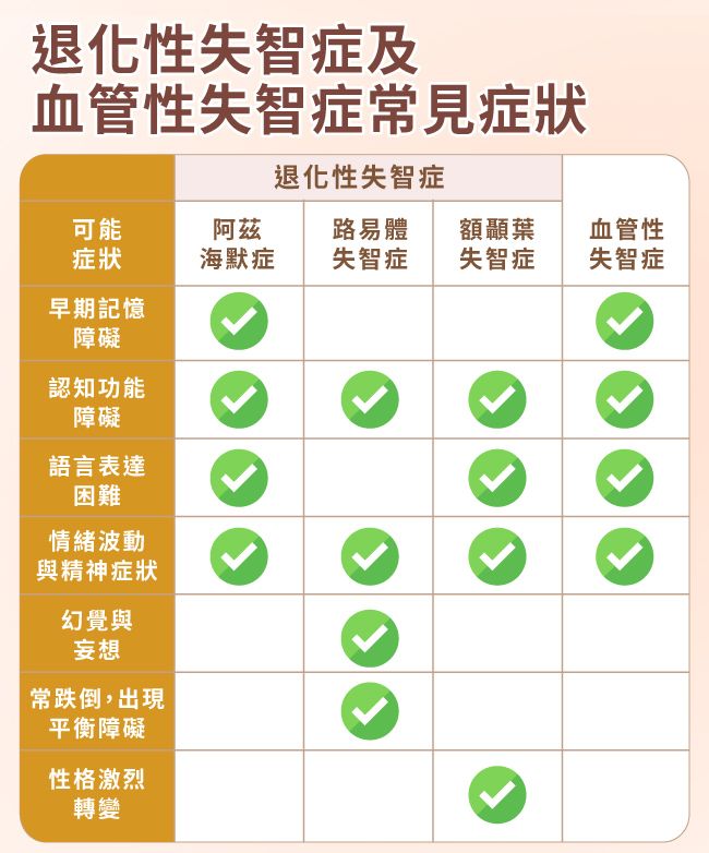 | 失智症 | -短期記憶減退,忘記原本熟悉的人事物,即使經過提醒也不記得,是全盤性的忘記。 -缺乏病識感(沒有意識到自己已生病),對於認知與日常生活起居有障礙。 |
