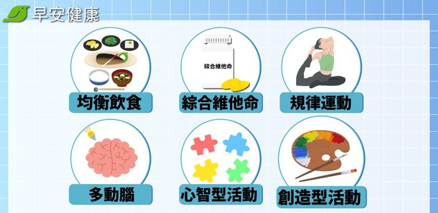 然而現代人生活忙碌,我們若無法透過日常均衡飲食吃到充足的營養素,也可以透過補充綜合維他命來輔助。刊載在美國阿茲海默症和失智症期刊上的研究顯示,每天吃綜合維他命能減緩認知退化表現六成,尤其是對於罹患心血管疾病的人群來說,更有顯著的效果。另外刊載在美國臨床營養學期刊上的研究也發現綜合維他命有助減緩記憶力衰退。研究顯示,維生素與礦物質能透過各種機制延緩阿茲海默症,且能保護神經元健康,緩解認知能力下降。