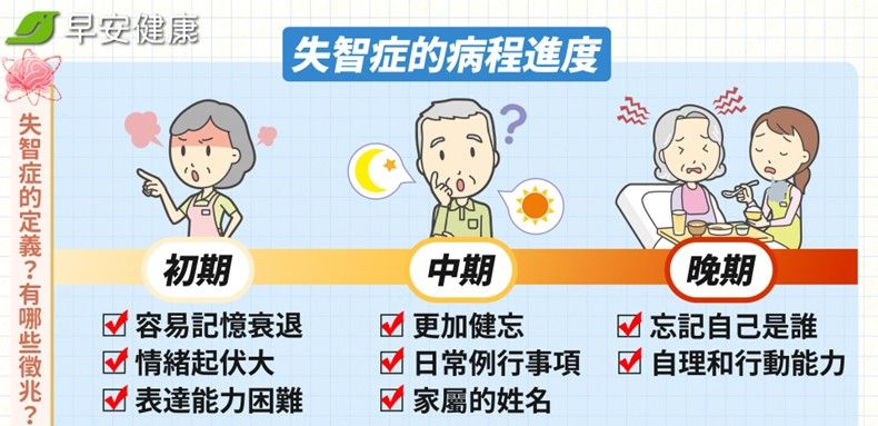 失智症是一種不可逆的漸進式病程,它是由腦部的精神,然後還有身體的系統疾病,或其他因素所引起的,分為初、中、晚期,以下逐一說明。