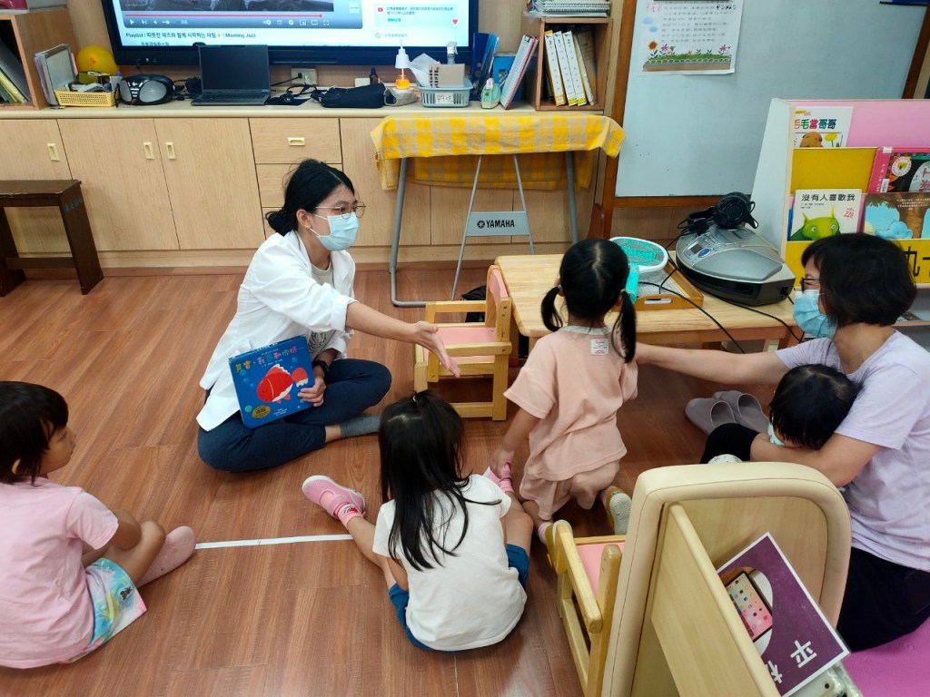 展臂閱讀外展服務團隊再次出發,北醫的醫師們前進偏鄉衛生所為學齡前親子開立閱讀處方,打開故事書的過程中,示範如何透過與孩子問答與討論,引導孩子們進一步思考,促進他們的語言發展和表達能力。