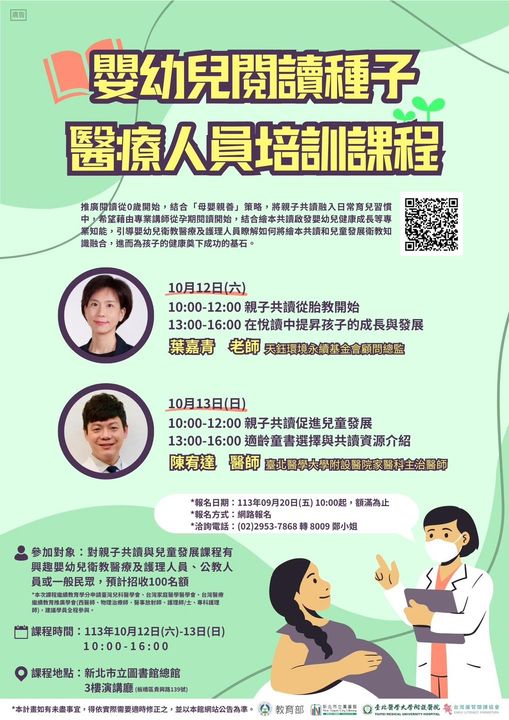 參加對象:對親子共讀與兒童發展課程有興趣的嬰幼兒衛教醫療及護理人員、公教人員及一般民眾,名額僅限 100 名!
