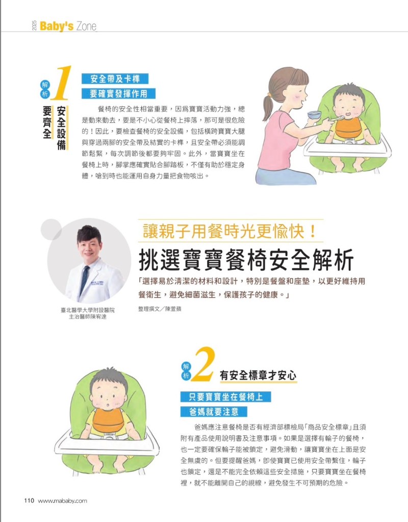 餐椅的安全性相當重要,因為寶寶活動力強,總是動來動去,要是不小心從餐椅上摔落,那可是很危險的!因此,要檢查餐椅的安全設備,包括橫跨寶寶大腿與穿過兩腳的安全帶及結實的卡榫,且安全帶必須能調節鬆緊,每次調節後都要夠牢固。此外,當寶寶坐在餐椅上時,腳掌應確實貼合腳踏板,不僅有助於穩定身體,嗆到時也能運用自身力量把食物咳出。
