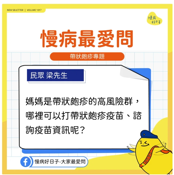 媽媽是帶狀皰疹的高風險群,哪裡可以打帶狀皰疹疫苗、諮詢疫苗資訊呢?圖/慢病好日子94愛你慣FB