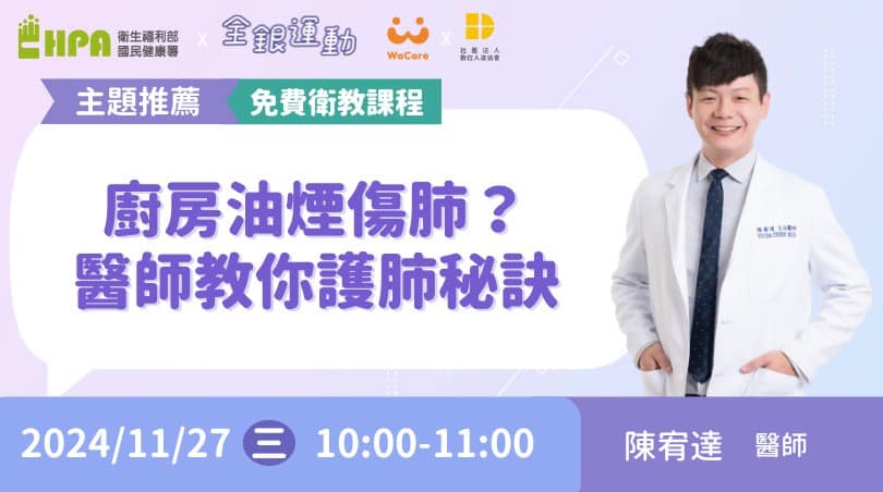 總是被煮飯時的油煙刺激喉嚨?工作時接觸的粉塵、抽菸,總是讓喉嚨卡卡的甚至咳嗽?或是報紙或網路總是說這個對肺不好,那個對肺不好,傻傻分不清楚。其實生活一些細節,都可能增加患上肺癌的風險!本次課程特別邀請家醫科主治醫師帶你全面了解如何保護肺部健康,學會預防肺癌的實用方法。