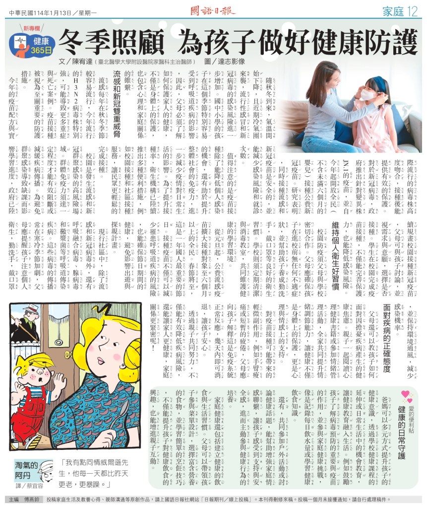 隨著秋冬的到來,氣溫開始下降,且近期冷氣團來襲,流行性感冒和新冠病毒的感染風險進一步增加。國中小學的孩子在這一季節特別容易受到呼吸道疾病的影響,因此,家長需要了解如何保護家人的健康,不僅是身體上的保護,也包含心理和家庭關係的維繫。