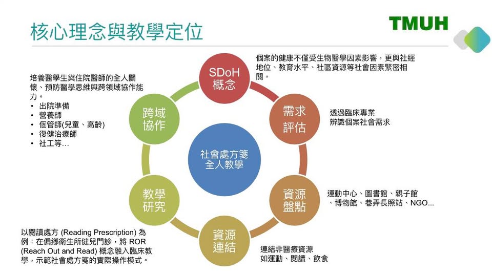 本北醫附醫教學長永續組會議中,陳宥達醫師以長年推動展臂閱讀計劃,包括獲得台灣傑出永續青年獎、北醫大校院永續獎的經驗,探討如何應用社會處方箋(Social Prescribing),特別是閱讀處方箋(Reading Prescription),在健兒門診實踐永續健康促進,提升醫療人員養成核心能力,並培養醫療體系的韌性(Resilience)。