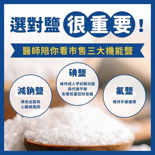 市面上的功能性鹽品(碘鹽、氟鹽、減鈉鹽)是因應國人營養缺乏與健康趨勢所推出的公共衛生策略。只要依個人健康狀況選擇適合的鹽種,就能吃對鹽、顧健康!