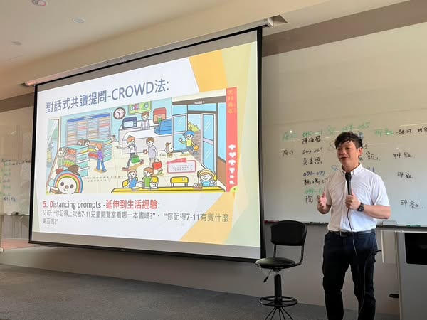 課程中,由陳宥達醫師主講「兒童發展歷程與閱讀行為」,以統一超商合作的「好朋友在哪裡」繪本設計為例,分享對話式共讀PEER法、CROWD法、嬰幼兒語言發展、親子互動、閱讀習慣養成的科學依據,並強調「早期素養萌發」的重要性,包括: