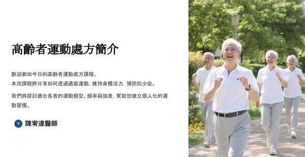 隨著年紀增長,長輩常面臨 肌少症、跌倒風險增加、慢性病惡化 等挑戰。這些問題會讓生活品質下降,甚至失去獨立性。而「高齡者運動處方」就是最重要的預防與治療策略,不需要藥物,卻能像藥一樣有效。特色在於 漸進式、安全、可持續,讓運動真正融入日常生活。